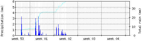 Das blaue Histogram zeigt die totale Niederschlagsmenge (oder deren Wassergehalt) in mm während des Messintervals. |