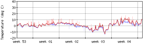 Die rote Kurve zeigt die Temperatur, die hellrote Fläche zeigt den Bereich zwischen höchsten und niedrigsten Temperatur während des Messintervals. Die blaue Kurve zeigt den Taupunkt, also die Temperatur, bei der sich Tau zu bilden beginnt. |