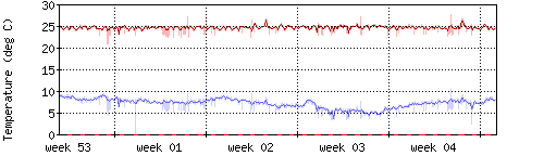 Die rote Kurve zeigt die Innentemperatur,die hellrote Fläche zeigt den Bereichh zwischen höchster und tiefster Temperatur während des Messzeitraums. |