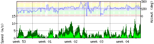 Der untere Teil des Graphen zeigt in hellgrün die mittlere Windgeschwindigkeit, die Spitzengeschwindigkeit ist dunkelgrün dargestellt, die zugehörige Skala findet sich am linken Rand. Der obere Teil des Graphen zeigt das Wind-Azimut in blau, die Skala steht am rechten Rand. |