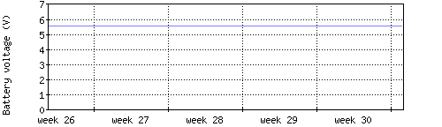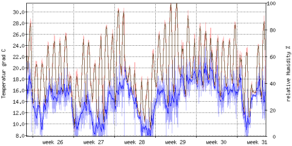 Die rote Kurve zeigt die Temperatur, die hellrote Fläche zeigt den Bereich zwischen höchsten und niedrigsten Temperatur während des Messintervals. Die blaue Kurve zeigt den Taupunkt, also die Temperatur, bei der sich Tau zu bilden beginnt. |
