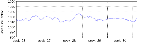 Der blaue Graph zeigt den mittleren Luftdruck, der Bereich zwischen grösstem und kleinstem Druck während des Messintervals ist in hellblau dargestellt. |
