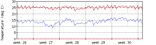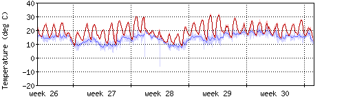 Die rote Kurve zeigt die Innentemperatur,die hellrote Fläche zeigt den Bereichh zwischen höchster und tiefster Temperatur während des Messzeitraums. |