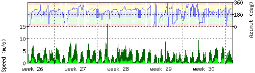 Der untere Teil des Graphen zeigt in hellgrün die mittlere Windgeschwindigkeit, die Spitzengeschwindigkeit ist dunkelgrün dargestellt, die zugehörige Skala findet sich am linken Rand. Der obere Teil des Graphen zeigt das Wind-Azimut in blau, die Skala steht am rechten Rand. |