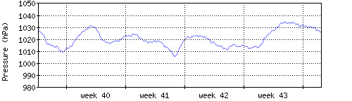 Der blaue Graph zeigt den mittleren Luftdruck, der Bereich zwischen grösstem und kleinstem Druck während des Messintervals ist in hellblau dargestellt. |