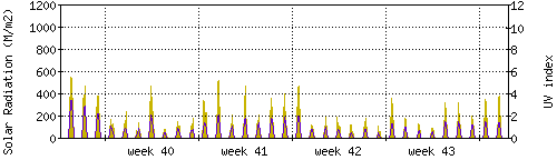 Das goldene Histogramm zeigt die totale Sonnestrahlung in W/m^2, die Skala befindet sich am linken Rand. Die violette Kurve zeigt den UV index, mit der Skala am rechten Rand. Man beachte, dass nach Schneefall die Messwerte nicht zuverlässig sind, weil die Sensoren nicht automatisch vom Schnee befreit werden. |