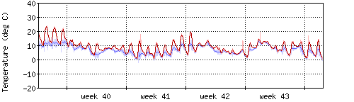 Die rote Kurve zeigt die Temperatur, die hellrote Fläche zeigt den Bereich zwischen höchsten und niedrigsten Temperatur während des Messintervals. Die blaue Kurve zeigt den Taupunkt, also die Temperatur, bei der sich Tau zu bilden beginnt. |