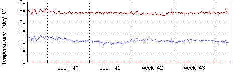 Die rote Kurve zeigt die Innentemperatur,die hellrote Fläche zeigt den Bereichh zwischen höchster und tiefster Temperatur während des Messzeitraums. |