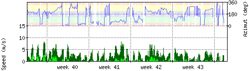Der untere Teil des Graphen zeigt in hellgrün die mittlere Windgeschwindigkeit, die Spitzengeschwindigkeit ist dunkelgrün dargestellt, die zugehörige Skala findet sich am linken Rand. Der obere Teil des Graphen zeigt das Wind-Azimut in blau, die Skala steht am rechten Rand. |