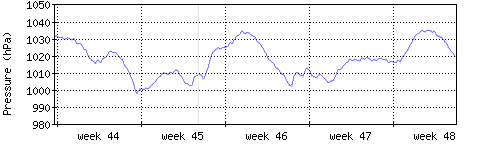 Der blaue Graph zeigt den mittleren Luftdruck, der Bereich zwischen grösstem und kleinstem Druck während des Messintervals ist in hellblau dargestellt. |