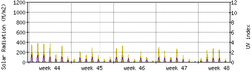 Das goldene Histogramm zeigt die totale Sonnestrahlung in W/m^2, die Skala befindet sich am linken Rand. Die violette Kurve zeigt den UV index, mit der Skala am rechten Rand. Man beachte, dass nach Schneefall die Messwerte nicht zuverlässig sind, weil die Sensoren nicht automatisch vom Schnee befreit werden. |