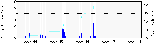 Das blaue Histogram zeigt die totale Niederschlagsmenge (oder deren Wassergehalt) in mm während des Messintervals. |