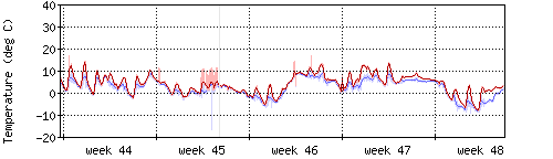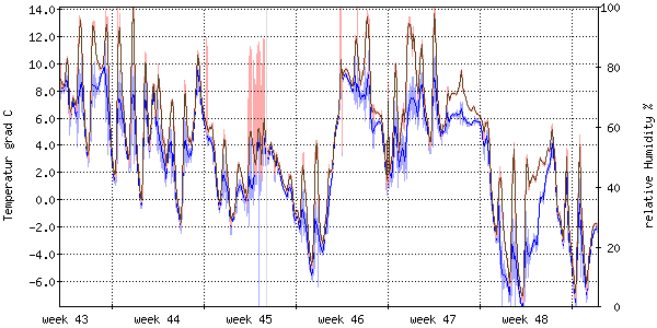 Die rote Kurve zeigt die Temperatur, die hellrote Fläche zeigt den Bereich zwischen höchsten und niedrigsten Temperatur während des Messintervals. Die blaue Kurve zeigt den Taupunkt, also die Temperatur, bei der sich Tau zu bilden beginnt. |