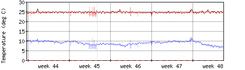Die rote Kurve zeigt die Innentemperatur,die hellrote Fläche zeigt den Bereichh zwischen höchster und tiefster Temperatur während des Messzeitraums. |