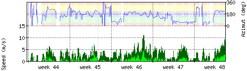 Der untere Teil des Graphen zeigt in hellgrün die mittlere Windgeschwindigkeit, die Spitzengeschwindigkeit ist dunkelgrün dargestellt, die zugehörige Skala findet sich am linken Rand. Der obere Teil des Graphen zeigt das Wind-Azimut in blau, die Skala steht am rechten Rand. |