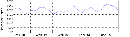 Der blaue Graph zeigt den mittleren Luftdruck, der Bereich zwischen grösstem und kleinstem Druck während des Messintervals ist in hellblau dargestellt. |