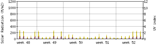 Das goldene Histogramm zeigt die totale Sonnestrahlung in W/m^2, die Skala befindet sich am linken Rand. Die violette Kurve zeigt den UV index, mit der Skala am rechten Rand. Man beachte, dass nach Schneefall die Messwerte nicht zuverlässig sind, weil die Sensoren nicht automatisch vom Schnee befreit werden. |