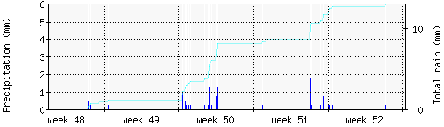Das blaue Histogram zeigt die totale Niederschlagsmenge (oder deren Wassergehalt) in mm während des Messintervals. |