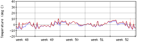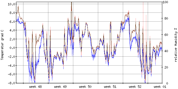 Die rote Kurve zeigt die Temperatur, die hellrote Fläche zeigt den Bereich zwischen höchsten und niedrigsten Temperatur während des Messintervals. Die blaue Kurve zeigt den Taupunkt, also die Temperatur, bei der sich Tau zu bilden beginnt. |