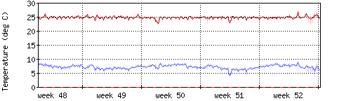 Die rote Kurve zeigt die Innentemperatur,die hellrote Fläche zeigt den Bereichh zwischen höchster und tiefster Temperatur während des Messzeitraums. |