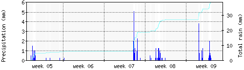 Das blaue Histogram zeigt die totale Niederschlagsmenge (oder deren Wassergehalt) in mm während des Messintervals. |