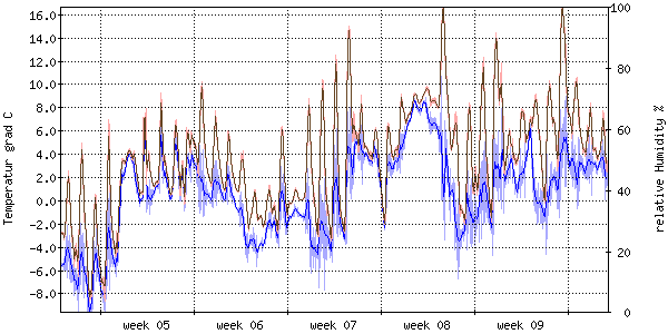 Die rote Kurve zeigt die Temperatur, die hellrote Fläche zeigt den Bereich zwischen höchsten und niedrigsten Temperatur während des Messintervals. Die blaue Kurve zeigt den Taupunkt, also die Temperatur, bei der sich Tau zu bilden beginnt. |