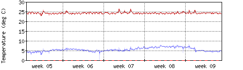 Die rote Kurve zeigt die Innentemperatur,die hellrote Fläche zeigt den Bereichh zwischen höchster und tiefster Temperatur während des Messzeitraums. |