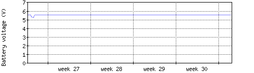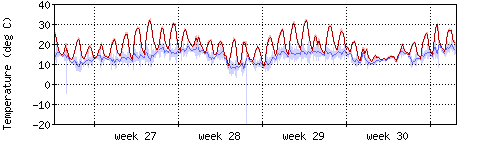 Die rote Kurve zeigt die Temperatur, die hellrote Fläche zeigt den Bereich zwischen höchsten und niedrigsten Temperatur während des Messintervals. Die blaue Kurve zeigt den Taupunkt, also die Temperatur, bei der sich Tau zu bilden beginnt. |