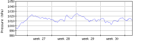 Der blaue Graph zeigt den mittleren Luftdruck, der Bereich zwischen grösstem und kleinstem Druck während des Messintervals ist in hellblau dargestellt. |