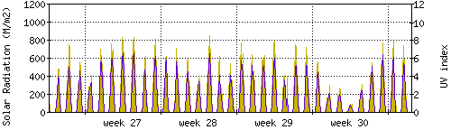 Das goldene Histogramm zeigt die totale Sonnestrahlung in W/m^2, die Skala befindet sich am linken Rand. Die violette Kurve zeigt den UV index, mit der Skala am rechten Rand. Man beachte, dass nach Schneefall die Messwerte nicht zuverlässig sind, weil die Sensoren nicht automatisch vom Schnee befreit werden. |
