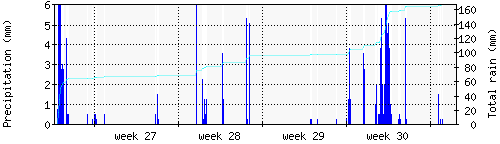 Das blaue Histogram zeigt die totale Niederschlagsmenge (oder deren Wassergehalt) in mm während des Messintervals. |
