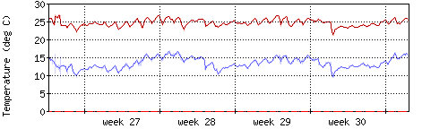 Die rote Kurve zeigt die Innentemperatur,die hellrote Fläche zeigt den Bereichh zwischen höchster und tiefster Temperatur während des Messzeitraums. |