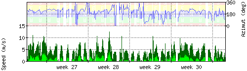 Der untere Teil des Graphen zeigt in hellgrün die mittlere Windgeschwindigkeit, die Spitzengeschwindigkeit ist dunkelgrün dargestellt, die zugehörige Skala findet sich am linken Rand. Der obere Teil des Graphen zeigt das Wind-Azimut in blau, die Skala steht am rechten Rand. |