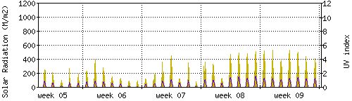 Das goldene Histogramm zeigt die totale Sonnestrahlung in W/m^2, die Skala befindet sich am linken Rand. Die violette Kurve zeigt den UV index, mit der Skala am rechten Rand. Man beachte, dass nach Schneefall die Messwerte nicht zuverlässig sind, weil die Sensoren nicht automatisch vom Schnee befreit werden. |