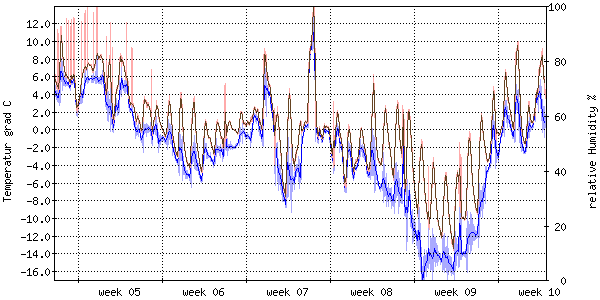 Die rote Kurve zeigt die Temperatur, die hellrote Fläche zeigt den Bereich zwischen höchsten und niedrigsten Temperatur während des Messintervals. Die blaue Kurve zeigt den Taupunkt, also die Temperatur, bei der sich Tau zu bilden beginnt. |
