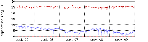 Die rote Kurve zeigt die Innentemperatur,die hellrote Fläche zeigt den Bereichh zwischen höchster und tiefster Temperatur während des Messzeitraums. |