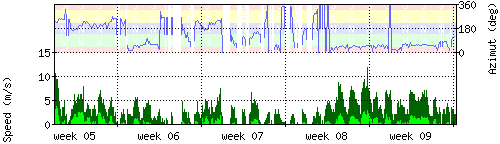 Der untere Teil des Graphen zeigt in hellgrün die mittlere Windgeschwindigkeit, die Spitzengeschwindigkeit ist dunkelgrün dargestellt, die zugehörige Skala findet sich am linken Rand. Der obere Teil des Graphen zeigt das Wind-Azimut in blau, die Skala steht am rechten Rand. |