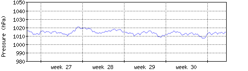 Der blaue Graph zeigt den mittleren Luftdruck, der Bereich zwischen grösstem und kleinstem Druck während des Messintervals ist in hellblau dargestellt. |