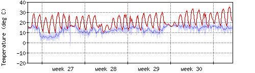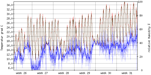 Die rote Kurve zeigt die Temperatur, die hellrote Fläche zeigt den Bereich zwischen höchsten und niedrigsten Temperatur während des Messintervals. Die blaue Kurve zeigt den Taupunkt, also die Temperatur, bei der sich Tau zu bilden beginnt. |