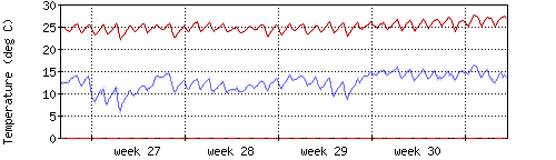 Die rote Kurve zeigt die Innentemperatur,die hellrote Fläche zeigt den Bereichh zwischen höchster und tiefster Temperatur während des Messzeitraums. |