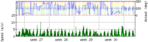 Der untere Teil des Graphen zeigt in hellgrün die mittlere Windgeschwindigkeit, die Spitzengeschwindigkeit ist dunkelgrün dargestellt, die zugehörige Skala findet sich am linken Rand. Der obere Teil des Graphen zeigt das Wind-Azimut in blau, die Skala steht am rechten Rand. |