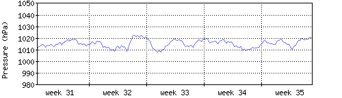 Der blaue Graph zeigt den mittleren Luftdruck, der Bereich zwischen grösstem und kleinstem Druck während des Messintervals ist in hellblau dargestellt. |