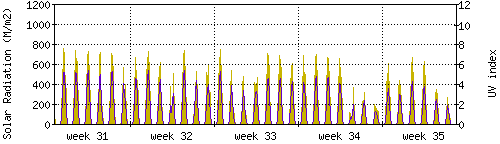 Das goldene Histogramm zeigt die totale Sonnestrahlung in W/m^2, die Skala befindet sich am linken Rand. Die violette Kurve zeigt den UV index, mit der Skala am rechten Rand. Man beachte, dass nach Schneefall die Messwerte nicht zuverlässig sind, weil die Sensoren nicht automatisch vom Schnee befreit werden. |