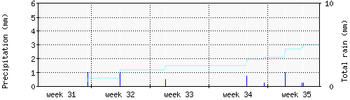 Das blaue Histogram zeigt die totale Niederschlagsmenge (oder deren Wassergehalt) in mm während des Messintervals. |