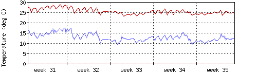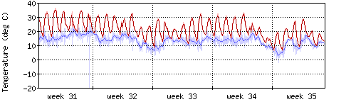 Die rote Kurve zeigt die Innentemperatur,die hellrote Fläche zeigt den Bereichh zwischen höchster und tiefster Temperatur während des Messzeitraums. |