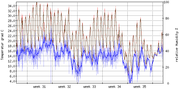 Die rote Kurve zeigt die Temperatur, die hellrote Fläche zeigt den Bereich zwischen höchsten und niedrigsten Temperatur während des Messintervals. Die blaue Kurve zeigt den Taupunkt, also die Temperatur, bei der sich Tau zu bilden beginnt. |