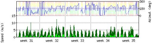 Der untere Teil des Graphen zeigt in hellgrün die mittlere Windgeschwindigkeit, die Spitzengeschwindigkeit ist dunkelgrün dargestellt, die zugehörige Skala findet sich am linken Rand. Der obere Teil des Graphen zeigt das Wind-Azimut in blau, die Skala steht am rechten Rand. |