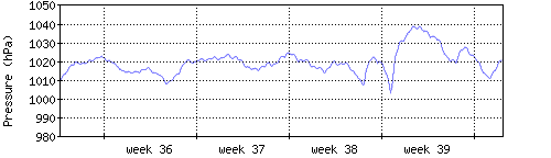 Der blaue Graph zeigt den mittleren Luftdruck, der Bereich zwischen grösstem und kleinstem Druck während des Messintervals ist in hellblau dargestellt. |