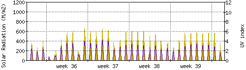 Das goldene Histogramm zeigt die totale Sonnestrahlung in W/m^2, die Skala befindet sich am linken Rand. Die violette Kurve zeigt den UV index, mit der Skala am rechten Rand. Man beachte, dass nach Schneefall die Messwerte nicht zuverlässig sind, weil die Sensoren nicht automatisch vom Schnee befreit werden. |