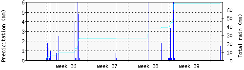 Das blaue Histogram zeigt die totale Niederschlagsmenge (oder deren Wassergehalt) in mm während des Messintervals. |